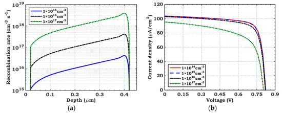 Impact of varying absorber defect density on (a) recombination inside Se and (b) J–V characteristics.