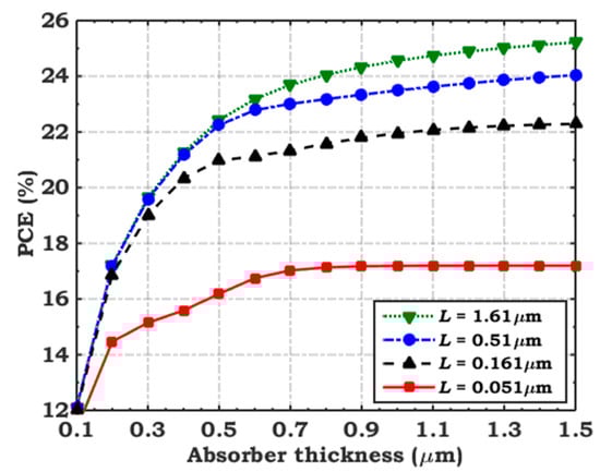 Variation of PCE with absorber thickness for distinct diffusion lengths.