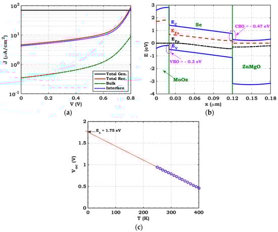 As is depicted in Figure 7b, the CBO at the Zn0.9Mg0.1O–Se interface is −0.47 eV (which represents an electron cliff), and the VBO at the MoOx–Se interface is −0.3 eV (which demonstrates a hole cliff). These alignments are not desirable in cell design as the interfaces are notorious for their severe recombination, which is primarily attributed to the cliff-like band offset [31]. In TFSCs, the preference is usually for flat bands or a slight spike-like profile [32]. Based on the previous results, it is thus evident that band alignment poses a significant issue in the initial Se solar cell for practical, specifically indoor, applications.