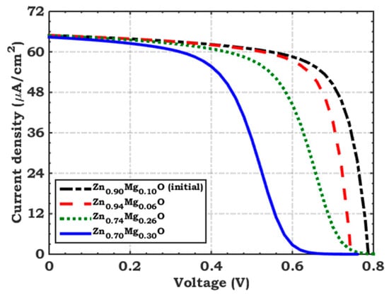 To engineer band alignment at the interface, the ternary compound Zn1−xMgxO is employed with x = 6, 18, 26, and 30% as an ETL. The variation in Eg and the electron affinity (χ) of Zn1−xMgxO with Mg content were obtained from the relevant literature [27], as demonstrated in Figure S3 (see the Supplementary Materials file). Additionally, the material parameters, used in the SCAPS, are extracted from previously published resources [23,27], as listed in Table S2. Figure 9 exhibits a comparison of the illuminated J–V curves for Se cells employing different x compositions. The corresponding output factors are recorded in Table 2. According to the simulation results, Zn1−xMgxO with x = 10 and 18% is identified as the most suitable ETL material due to its predicted CBOs of −0.47 and −0.31 eV, respectively. However, it is important to consider the majority barrier height between the ETL and the FTO electrode, which likewise significantly influences performance. Therefore, Table 3 presents both the CBO values and the majority barrier height (ΦF), specifically for electron transport, for the diverse ETL materials. It is noted that the S-shaped behavior in the J–V curves arises from the band misalignment between the ETL and the FTO electrode, which is influenced by the value of ΦF. This misalignment leads to an electric field that restricts electron transport to the electrode, causing the observed kink behavior. Among the materials tested, Zn0.85Mg0.15O exhibits the highest ΦF, which contributes to the distinctive S-shaped appearance.