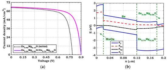 In this part, we examine the integration of a double-ETL structure consisting of Zn0.74Mg0.26O (measuring 20 nm in thickness) as an adjacent layer to the FTO, along with a Zn0.74Mg0.26O layer measuring 60 nm in thickness. Figure 10a displays a comparison of the J–V curves under illumination for the initial Se cell and the Se cell employing the Zn0.94Mg0.06O/Zn0.74Mg0.26O double-ETL configuration. As can be noticed, the energy difference between the LUMO level of the second ETL (Zn0.74Mg0.26O) and that of the absorber is tuned to be low enough (CBO = −0.08 eV) to facilitate electron injection, as shown in Figure 10b compared to Figure 7b. Additionally, the difference between the FTO work function and the LUMO level of the first ETL (Zn0.94Mg0.06O) is well designed (ΦF = 0.25 eV). The output metrics, in this case, are as follows: Jsc = 65.63 μA/cm2, Voc = 0.9 V, FF = 71.49%, and PCE = 13.63%. Thus, the double-ETL design can improve cell performance and provide higher efficiency. The utilization of Zn0.94Mg0.06O/Zn0.74Mg0.26O as a double ETL in the presented cell leads to a significant percentage increase of approximately 15.70% compared to that of the initial Se cell.
