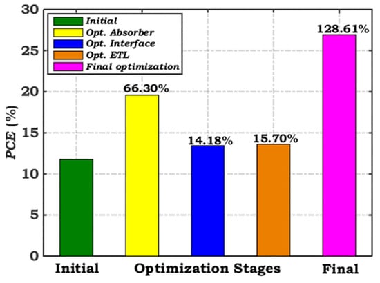 PCE variation for various optimization scenarios of the Se cell, showing the relative percentage enhancements in calculated efficiency.