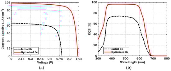 A comparison between (a) J–V under illumination and (b) EQE spectra of initial and final optimized Se cells.