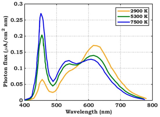 This subsection presents the simulation results concerning the behavior of the initial Se cell under distinctive conditions. The influence of the indoor white LED light’s color temperature and that of the absorber bandgap on the PV metrics of the cell are simultaneously examined. The spectra of white LEDs used in the study comprise an intense blue emission. The illuminance of the incident LED light can be amended within the range of 200 to 10,000 lux, corresponding to an intensity range of 57.9–2895 µW/cm2 [28]. Extracted from [28], Figure 13 showcases the relationship between wavelength and photon flux for incident LED light sources of different color temperatures. A color temperature of 7500 K represents a cool white LED, where the photon flux is at its maximum at about 450 nm. For a color temperature of 5300 K, there is a slight additional maximum point around 630 nm. A warm-white LED with a temperature of 2900 K shows a maximum photon flux of around 630 nm.