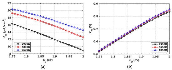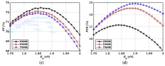 It is well known that the energy band depends strongly on the fabrication process of Se films [39,40]. Thus, we explored the influence of changing the bandgap of the absorber from 1.75 to 2 eV on the performance metrics of the cell. The simulation results are demonstrated in Figure 14. It can be observed from Figure 14a that the behavior of Jsc shows an enhancement with increasing temperature, while it declines with an increase in the absorber bandgap. This can be attributed to the fact that the lower-bandgap absorber has higher potential for capturing photons originating from the extended wavelength region of the visible spectrum, which is in excellent agreement with the spectral characteristics of the white LED spectrum (as shown in Figure 13).