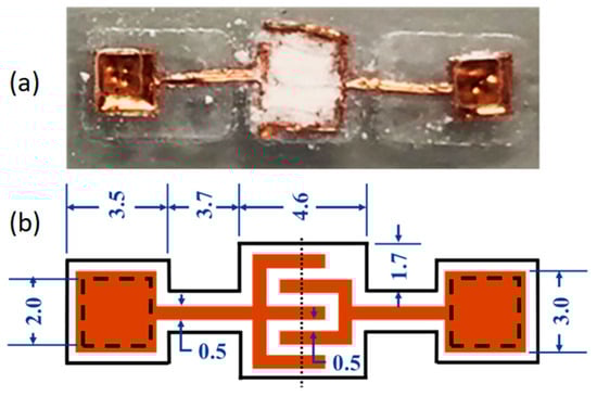 Flexible nanopowder-based UV radiation sensor (a) and scheme with dimensions in millimeters (b).