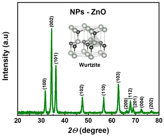 The XRD results for ZnO nanopowder are shown in Figure 3. The peaks in Figure 3 at 2θ = 31.9°, 34.5°, 36.35°, 47.6°, 56.6°, 62.9°, 66.4°, 67.9°, 69.2°, 72.6°, and 77.0° correspond to (100), (002), (101), (102), (110), (103), (200), (112), (201), (004), and (202) planes, respectively. These peaks correspond to the typical signals of ZnO and confirm the formation of the wurtzite structure with a hexagonal phase, according to (JCPDS card no. 36–1451) and previously published studies [,]. Table 1 shows the crystallite size of the ZnO nanopowder calculated using the Scherrer equation: