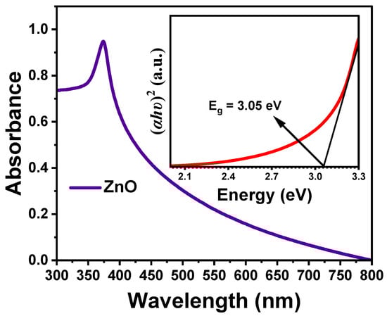where hν is the photon energy, and n is a number that depends on the nature of the electronic transitions responsible for the absorption. For a semiconductor with a direct bandgap, which is the case for ZnO, n equals 2 []. Eg was determined by fitting the linear part of (αhν)2 vs. hν dependence, extrapolated to the energy axis (inset Figure 5). The optical band gap obtained for ZnO was ~3.05 eV.