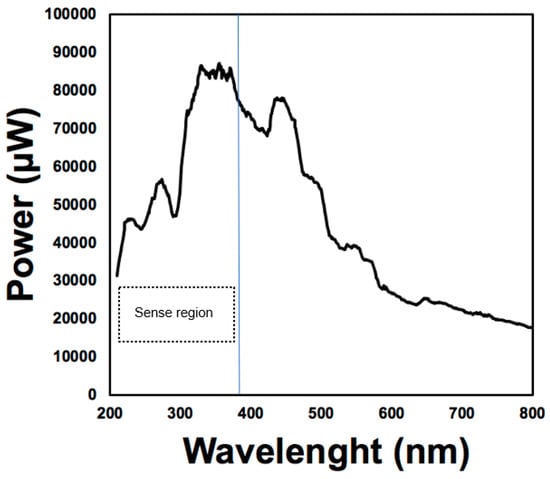 The electrical characterization of the ZnO nanopowder-based flexible UV sensor was performed using a Keitlhey 2400-C Source Monitor Unit with 4-wire configuration at ambient temperature. The GUI used was the “I-V Measurements” developed by Dr Michael Kelzenberg. The UV source was a typical 5 mm UV LED with a wavelength centered at 395 nm. The optical power of the UV source was measured with a Thorlabs (Newton, NJ, USA) PMUSB100 Power Meter with a Thorlabs S120VC Sensor (Si Photodiode UV Extended) in a 200 to 800 nm range. The software used was the “Optical Power Monitor” from Thorlabs. The optical power for every wavelength is shown in Figure 6. The spectral region of the UV source that is positioned to the left of the blue line in Figure 6 is potentially detectable by the proposed UV sensor. The optical power density of the UV source at 395 nm was 120 mW/cm2. The distance between the UV sensor and all the illumination sources was 50 mm.