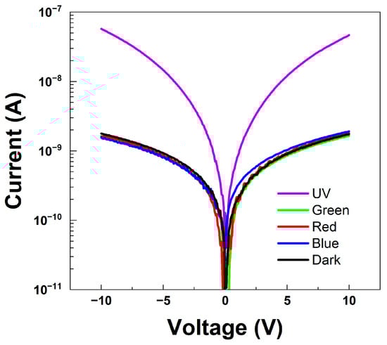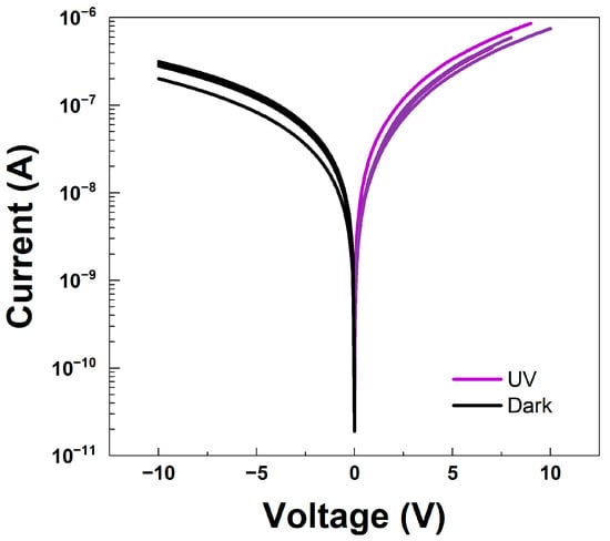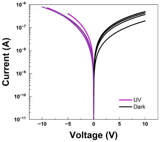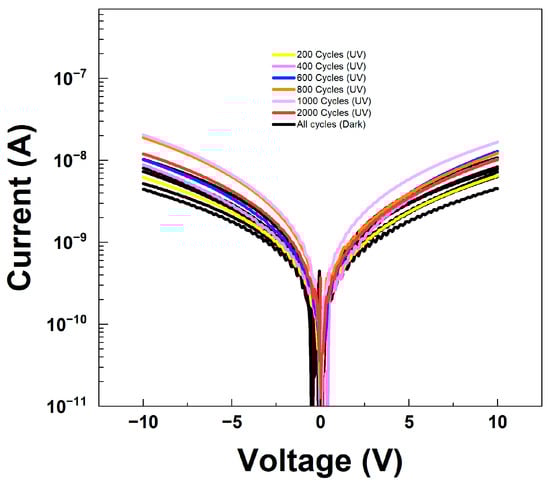 In Figure 13, it can be observed that the 0 V to −10 V discharge voltage-sweep improves the performance of the forward I-V characteristics under UV illumination, reducing the variation in the currents in comparison to Figure 11 and Figure 12.