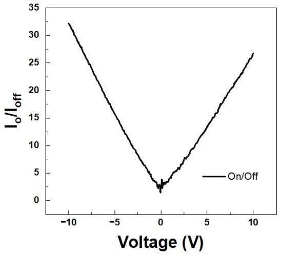 The I-V characteristics of the flexible UV photosensor in the dark and under red, green, blue, and UV illumination are depicted in Figure 7. The curves obtained under red-, green-, and blue-light illumination coincide with the dark current. The purple line represents the electrical characteristic of the sensor under UV radiation. Figure 8 shows the Ion/Ioff ratio in the 0 to ±10 V range reaching values of ~3.2 × 101. In Figure 9, the rectification ratio of the sample was measured, obtaining a constant value of ~1.25 in the entire range. The UV-Vis (red, green, blue) rejection ratio is depicted in Figure 10. At −10 V for the three different visible sources, the rejection ratio was ~35.