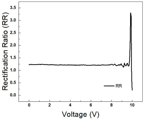 Rectification ratio in the 0 to ±10 V range of the flexible UV sensor.