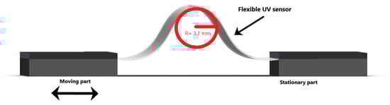 The UV flexible sensor was subjected to bending cycles. The sensor was positioned in a bending machine where one side of the sensor was fixed to a stationary part and another side was attached to a moving part. The bending cycle consisted of a moving part that moved back and forth, achieving a bend with a ratio of ~3.1 mm, as can be observed in Figure 15. I-V measurements under UV radiation and in the dark were carried out after 200, 400, 600, 800, 1000, and 2000 cycles. The I-V characteristics after the bending cycles are shown in Figure 16; as was expected, the current measured under UV was always larger than the dark current. After every 200 bending cycles, an increment in the current can be observed. This increment is attributed to trapped charges in the ZnO. In the curve corresponding to 2000 bending cycles, a decrease in the current can be observed; this is attributed to the time elapsed between the measurement after 1000 bending cycles and the 2000 bending cycles. When a large amount of time is elapsed between measurements, the current value decreases due to a discharge process in the sensor over time.