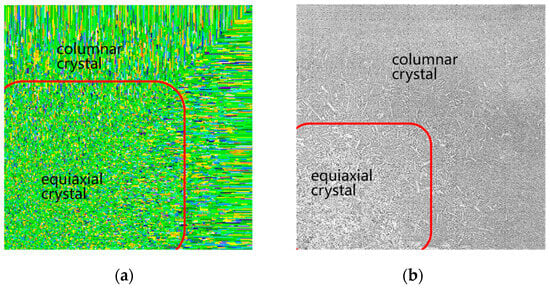 The iron and steel industry is an important industry in the foundation of the national economy and an important area for realising green and low-carbon development. More than 80% of the world’s casting process is related to the continuous casting process, and the steel industry every year suffers losses amounting to hundreds of millions of dollars due to billet quality problems, causing direct economic losses. Therefore, billet quality detection is one of the important problems in the steel industry. The solidification structure reflects the quality of the cast billet [1,2,3], and the macroscopic solidification structure of the cast billet usually consists of three parts: fine equiaxed crystals on the surface, columnar crystals, and central equiaxed crystals. The equiaxed crystal ratio is one of the important indicators of the quality of cast billet [4,5], and it is usually hoped to obtain a large equiaxed crystal ratio of cast billet except for in some special-purpose steel grades that require a columnar crystal structure. The larger the equiaxed crystal ratio of the cast billet, the better the stability of the cast billet [6]. Several researchers have used numerical simulation methods such as phase field models [7,8,9,10] and metameric automata models [11,12,13] to study the structure changes during metal solidification [14,15,16,17] for controlling the quality of cast billets. Ideally, the simulated image should be consistent with the solidification organization of the actual as-cast image, but in the practical situation, there are often some differences between the simulated image and the actual low-magnification specimen, as shown in Figure 1. Improvement of solidification modelling accuracy has become a key issue that needs to be solved [18,19,20].