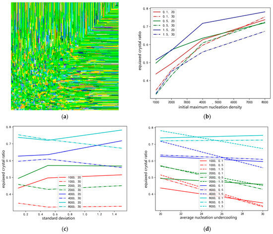 (a) Numerical simulation image. (b) Relationship between initial maximum nucleation density and equiaxed crystal ratio. (c) The relationship between average nucleation undercooling and equiaxed crystal ratio. (d) Relationship between standard deviation and equiaxed crystal ratio.