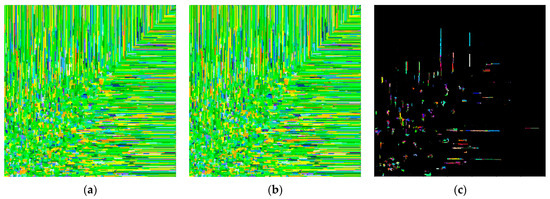 Two simulated low-magnification images with an initial maximum nucleation density of 1000 and an average nucleation undercooling of 20 were selected, with standard deviations of 0.1 and 1.5, as shown in Figure 3a,b, and the difference between Figure 3a,b is presented in Figure 3c. Let the pixel in Figure 3c with a grey value not equal 0, and the proportion of different regions to the image in Figure 3a,b was found according to Equation (23).