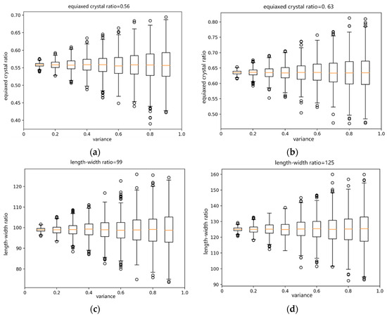 (a) Error distribution for equiaxed crystal ratio of 0.56 error. (b) Error distribution for equiaxed crystal ratio of 0.63. (c) Error distribution for length–width ratio of 99. (d) Error distribution for length–width ratio of 125.