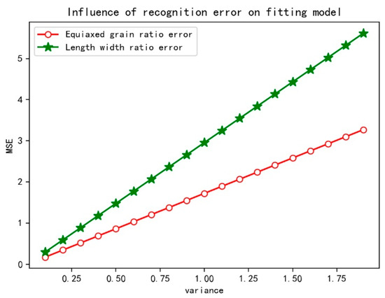 The recognition error was simulated by adding random Gaussian noise to the equiaxed crystal ratio and length–width ratio data. We added 1000 groups of random noise within 20% error to the equiaxed crystal ratio and length–width ratio data, respectively, and the noise distribution is shown in Figure 4. The average of the mean square error of the fitting results of the 1000 groups of data was calculated, and the variation of the mean square error is shown in Figure 5. It can be seen from Figure 5 that in a Gaussian noise environment, the recognition error effect on the uncertain parameter fitting increases with increasing variance when the recognition error is less than 20%. Both length–width ratio and equiaxed crystal ratio recognition errors increase linearly, and the recognition error of the length–width ratio has a greater effect on fitting uncertain parameters than the recognition error of the equiaxed crystal ratio.