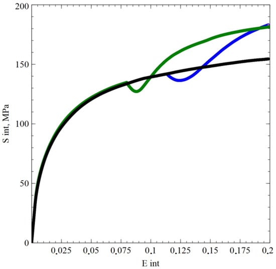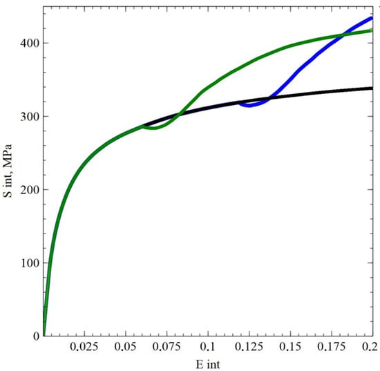 Dependence of stress intensities (S int) on accumulated deformations (E int) for the trajectories with simple (black line, uniaxial tension) and complex (green line up to 8% and blue line up to 12% accumulated deformations, tension with subsequent shear) loading programs for copper. AH = 16.8% and 17.1%.