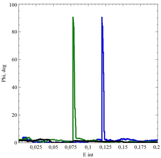 Dependence of the angle between the stress vector and the tangent to the trajectory for the trajectories on accumulated deformations (E int) with simple (black line) and complex (green and blue lines) loading modes for copper.