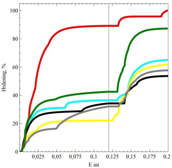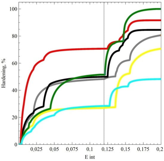Dependence of the intensity of hardening on the accumulated strains for a trajectory according to a complex loading program (tension up to 12% of accumulated strains followed by shear) for a crystallite of a copper alloy; the colors depict strengthening by six types of dislocation interactions, and the color legend corresponds to Figure 5.