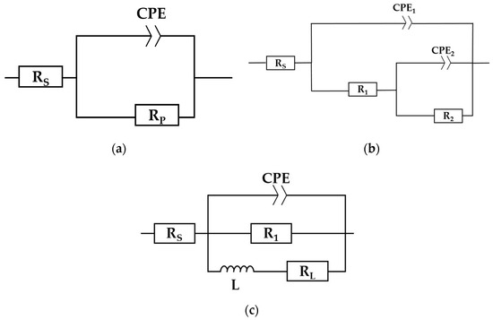 with n described as follows: when n equals to 1, the CPE is a pure capacitance, whereas when the value of n is equal to 0, the CPE is a pure resistance. The equivalent circuit with an inductive loop consists of the inductive resistance (RL), the charge transfer resistance of the base material (R1), and the inductive element L, representing the inductance (Figure 1b). The appearance of an inductive loop is associated with the adsorption and desorption of the intermediate species at the low-frequency section [26]. For the analysis of the Nyquist diagrams, the equivalent circuit method was used [23,27,28]. Polarization resistance Rp describes the impedance of the measured system, and it is directly related to the corrosion resistance of the measured surface [24].