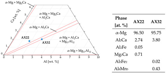 Figure 2 shows the calculated ternary phase diagram of Mg-Al-Ca at room temperature (RT) and the corresponding phase fractions of AX22 and AX32 given in atomic percent (at. %). The alloy AX22 is located in the α-Mg + Mg2Ca + Al2Ca phase region while AX32 is located in the region α-Mg + Al2Ca. As can be seen in the calculated values, the higher Al content of AX32 leads to a significantly increased amount of Al2Ca (3.80 at. % in AX32 in comparison to 2.74 at. % in AX22). At the same time, no Mg2Ca can be found in AX32, while in AX22 the amount of Mg2Ca is calculated to be 0.71 at. %. The total amount of Ca-containing phases is 3.80 at. % in AX32 (Al2Ca) and 3.45 at. % in AX22 (Al2Ca + Mg2Ca). It should be mentioned that (Mg,Al)2Ca is not stable at RT; therefore, the equilibrium calculation does not determine this phase. Nevertheless, this phase can also occur at RT in cast samples produced using conventional solidification conditions. Furthermore, Fe-containing phases can be found, which are Al2Fe in AX22 and Al5Fe2 in AX32. The lower Fe-content in AX32 compared to AX22 can be due to settling of Mn-Fe particles in the melt before casting the material [33]. According to the calculation, the Fe-content in Al8Mn5 is negligible, while according to the literature, this phase plays an important role in binding Fe [34].