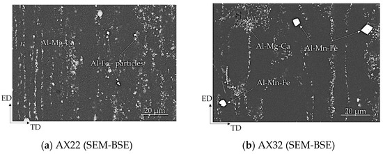 Figure 3a,b show the microstructures of the extruded alloys in transverse direction (TD). Al and Ca containing intermetallic phases are arranged along the extrusion direction (ED) in both alloys, corresponding well with the literature [16,35] and the calculated ternary phase diagram. A distinction between Al2Ca and (Mg,Al)2Ca was not possible via EDS. While the total amount of intermetallic phases is comparable in both alloys, no Mg2Ca was found in AX22. In AX22 (Figure 3a), fine particles (<5 µm) are homogenously dispersed in the matrix. The EDS analysis identified Al and Fe, while in AX32 (Figure 3b), Al-Mn-Fe phases form instead, due to the presence of Mn. While both alloys show similar grain sizes (average grain sizes: AX22 = 9 μm, AX32 = 12 μm), the Fe-containing intermetallic phases are larger, and the Ca-containing phases are smaller in AX32.