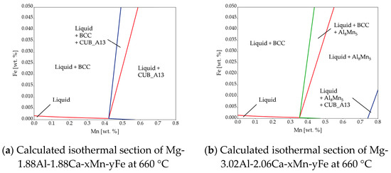 In the calculated isothermal sections (Figure 4a,b), the solubility limit of Fe at 660 °C in AX22 and AX32 is shown as a function of the Mn content. In both cases, the solubility of Fe is rather small (<30 ppm). When the Fe content exceeds this solubility limit, primary Fe-phases form in the melt. In Mg-Al-Ca alloys without Mn, as in AX22, the phases are of the type AlxFey. With the addition of Mn, Al-Mn-Fe phases with variable stoichiometry and crystal structure (BCC, CUB_A13 and Al8Mn5) can be formed. These Mn-containing phases are known to bind Fe, thereby improving the corrosion resistance of the alloys by reducing the microgalvanic effect between the Mg matrix and Fe-containing intermetallic phases [20,36].