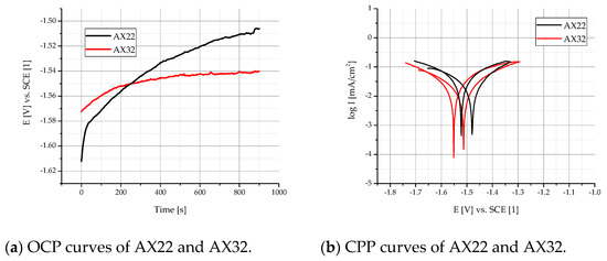 The corrosion properties were examined in the transverse direction TD (cf. Figure 3). Figure 5a shows the open circuit potential (OCP) curves of extruded AX22 and AX32 immersed in 0.01 M NaCl solution for 900 s. At the beginning of the test, the OCP value of AX22 is ~40 mV/SCE lower than that of AX32. During the test, the OCP values of both alloys increase. The value for AX22 shows a steeper increase, and after ~250 s, the OCP of AX22 is higher than that of AX32. The small fluctuations in the curves can be a sign of ongoing pitting corrosion [16,37]. The higher OCP values for AX22 indicate a higher thermodynamical stability compared to AX32. The more negative potential value of AX32 is most likely attributed to the differences in the Fe- and Ca-containing phases in the alloys. Based on the calculations (Figure 2), the number of Fe-containing phases in AX32 is lower than in AX22, while at the same time, the proportion of Al2Ca is higher. According to Mingo et al., the Al2Ca phase has a higher positive potential compared to the Mg matrix [38]. Due to this, the corrosion of the substrate is accelerated because Al2Ca acts as a cathode. Furthermore, the calculation shows a presence of Mg2Ca in AX22. The Mg2Ca phase has a more negative corrosion potential than the Mg matrix, therefore acting as an anode [39]. During the corrosion process, this phase dissolves first and protects the α-Mg matrix against corrosion.
