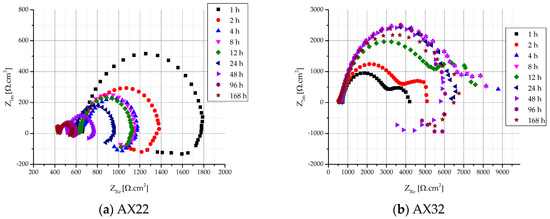 To provide a more precise evaluation of the electrochemical behavior of AX22 and AX32 alloys during corrosion, EIS measurements were caried out. Figure 6 shows the Nyquist plots of AX22 (Figure 6a) and AX32 (Figure 6b) immersed in 0.01 M NaCl solution. The corresponding results of electrochemical corrosion characteristics are given in Table 3 and Table 4. It can be seen in Figure 6a,b that the Nyquist plots of both alloys consist of two types of electrochemical processes: a high-frequency capacitance loop representing the charge transfer reaction of surface oxide or hydroxide film and a low-frequency inductance loop expressing the adsorption and desorption of the intermediate species [43]. According to Yang et al., the appearance of an inductance loop is caused by pitting corrosion [15]. However, the appearance of the inductive loop can also be attributed to the dissolution caused by chlorides [29]. The charge transfer reaction represents the exchange of electrons between molecules or atoms; thus, this describes the oxidation and reduction process [44]. Corrosion resistance is determined based on the size of the loop radii of the single lines in the Nyquist plots [45].