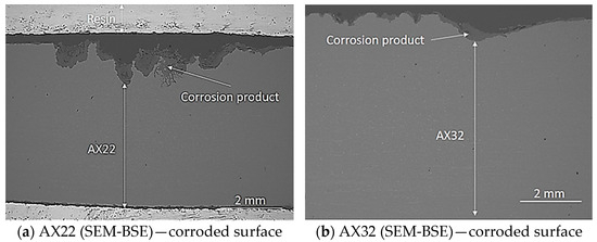 Figure 5b shows the cyclic potentiodynamic polarization (CPP) curves for both alloys. The curves were analyzed via Tafel extrapolation analysis and were plotted on the semi-logarithmic scale. From the Tafel analysis of the CPP curves, the following corrosion characteristics were obtained: corrosion potential (Ecorr), corrosion current density (icorr), corrosion rate (rcorr), and Tafel constants (βa and βc). The values are summarized in Table 2. While the thermodynamic part of the corrosion reaction is described by Ecorr, the description of the kinetic part is attributed to icorr. The value of the corrosion current density (icorr) is significantly higher for AX22 (20.40 μA cm−2) than for AX32 with 9.81 μA cm−2. This can most likely be attributed to the described formation of Al-Mn-Fe particles in AX32 and Al-Fe particles in AX22 and the differences in Ca-containing phases. As already stated, ferrous particles containing Mn have less negative influence on electrochemical behavior of Mg alloys, because they have a lower microgalvanic effect than particles without Mn, i.e., Al2Fe and Al5Fe2 [34]. Therefore, the lower content of Fe and the higher amount of Mn in AX32 can contribute to the improved corrosion behavior of the alloy [40]. Furthermore, it is suspected that the size of the intermetallic particles has an influence on the corrosion characteristics; nevertheless, this effect cannot be elaborated in detail with the corrosion measurement methods used. However, extruded Mg alloys are characterized by a strong basal texture, which is coupled with the hexagonal crystal structure of the alloys. According to Jeong et al. and Liu et al., the crystal plane orientation and the basal texture of Mg alloys have a great influence on the corrosion behavior [35,41]. The obtained value for the corrosion potential (Ecorr) is higher for AX22 (−1475 mV) than for AX32 (−1482 mV), which is assumed to be an effect of the higher Al and Ca content in AX32. For example, Yang et al. found that with increasing Ca content, the value of Ecorr decreases [15]. Furthermore, the value of the corrosion rate (rcorr) is lower for AX32 (0.23 mm/y) compared to AX22 (0.47 mm/y), which is attributed to the lower value of icorr for alloy AX32 as rcorr can be calculated using Faraday’s law according to the following equation [42]: