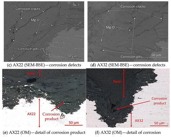 Figure 7 shows OM and SEM micrographs of the corroded areas of AX22 (Figure 7a,c,e) and AX32 (Figure 7b,d,f) after 168 h EIS measurement in 0.1 M NaCl solution. The corrosion is more pronounced in AX22 (Figure 7a) than in AX32 (Figure 7b). This can potentially be attributed to the lower amount of Al in AX22, as a higher content of Al atoms promotes the formation and compactness of protective corrosion films (Al(OH)3 or Al2O3) during the corrosion process [30] and the reduced microgalvanic effect of Fe in AX32 due to the presence of Mn. In addition, the alloying element Ca can also form an adherent oxide film on the surface of magnesium alloys. This surface film can act as a protection against corrosion caused by Cl− ions. The reaction of Ca with atmospheric CO2 thereby ensures the formation of hydroxides and carbonates [46]. Common corrosion products of Mg-Al-Ca alloys can include the following compounds: MgO, Mg(OH)2, Al2O3, Al(OH)3, CaO, and Ca(OH)2. The EDX analysis of the corrosion products formed on AX alloys (Table 5) showed primarily Mg-containing oxides, i.e., MgO and/or Mg(OH)2. These products are porous; therefore, the aggressive solution can continuously penetrate though this protection and react with the magnesium substrate [47].