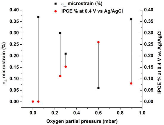 The microstrain and IPCE percentages as a function of PO2 [34].