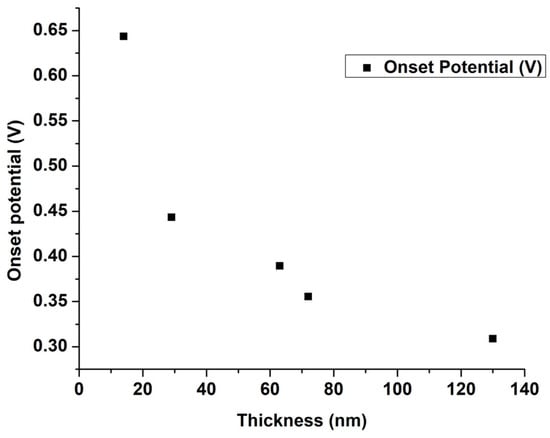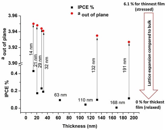 A detailed study related to the influence of ultra-thin LFO/STON film thicknesses (2–25 nm) on their photoelectrochemical performance was reported [54]. During the cyclic voltammetry measurements, all LFO films show asymmetric currents with regard to forward and reverse potentials, this behavior being correlated to the n-p heterojunction created between the substrate and film. All samples show a photoanodic response; the photocathodic response is observed, instead, only for samples having 10–25 nm thicknesses [54]. The effect of thicker LFO films (14–192 nm) prepared by PLD on their photoelectrochemical performances was also reported [55]. The out-of-plane parameters increase with the film thickness, and this increase is assisted by a decrease in the lattice expansion, in contrast to bulk LFO, as presented in Figure 4. Supplementarily, the incident photon-to-current efficiencies decrease with the increase in film thickness. The onset potentials are, also, affected by the thicknesses of LFO films, as can be seen in Figure 5. For thinner films, the onset potential is higher and it decreases with the increase in the film thickness [55].