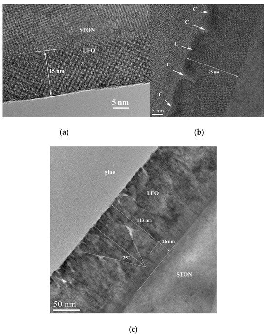 (a) High-resolution TEM images for thin (15 nm) LFO/STON sample; (b) the crevasse-like defects appearance noticed from the high-resolution TEM images for thin (25 nm) LFO/STON sample; (c) low-magnification TEM image for thick (132 nm) LFO/STON sample. Figure reprinted from ref. [55] under a Creative Commons Attribution 4.0 International License.