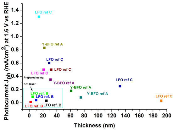 The highest photoelectrochemical performance was obtained for the thinnest film with the maximum value of photocurrent of Jph = 1.23 mA/cm2 at 1.6 V applied potential vs. RHE [42]. Moreover, unassisted hydrogen was produced for the thinnest film, an amount of 6.5 μmole/cm2 of hydrogen being produced after 4 h [55]. Both LFO and Y-BFO films prepared by using an ArF excimer laser (193 nm) show better photoelectrochemical performances than LFO films prepared by a KrF excimer laser (248 nm), as can be observed in Figure 7. However, the highest photogenerated current is obtained for the LFO film having a thickness of 14 nm, no BFO film with the same thickness being available for comparison.