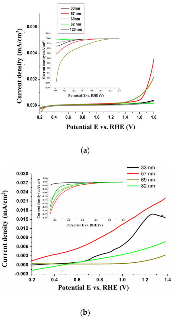 LFO films with different thicknesses (33–120 nm) on Nb-STO substrates were grown by PLD, starting from a ceramic LFO target. The electrolyte solutions in which photoelectrodes are tested play an important role in the overall photoelectrochemical activity. The photoelectrochemical performance of LFO films in different electrolytes solutions is reported. In an alkaline electrolyte with pH = 13.5 (0.5 M NaOH), the generated current density under dark conditions is almost 0 along the entire potential range, as presented in Figure 8a. The values of current densities obtained without illumination in an acidic electrolyte, pH = 5.6 (Na2SO4 1M adjusted with H2SO4 0.5 M), are much higher for all thicknesses in both cathodic and anodic regions (Figure 8b). Even though, in some cases, the values are almost six times higher than those obtained in alkaline conditions, the catalytic activity in the absence of light can be considered negligible.