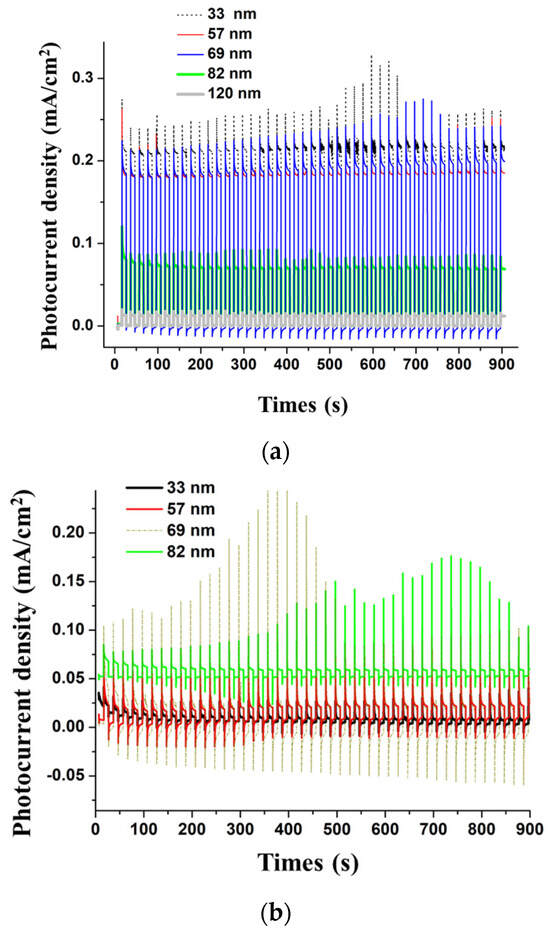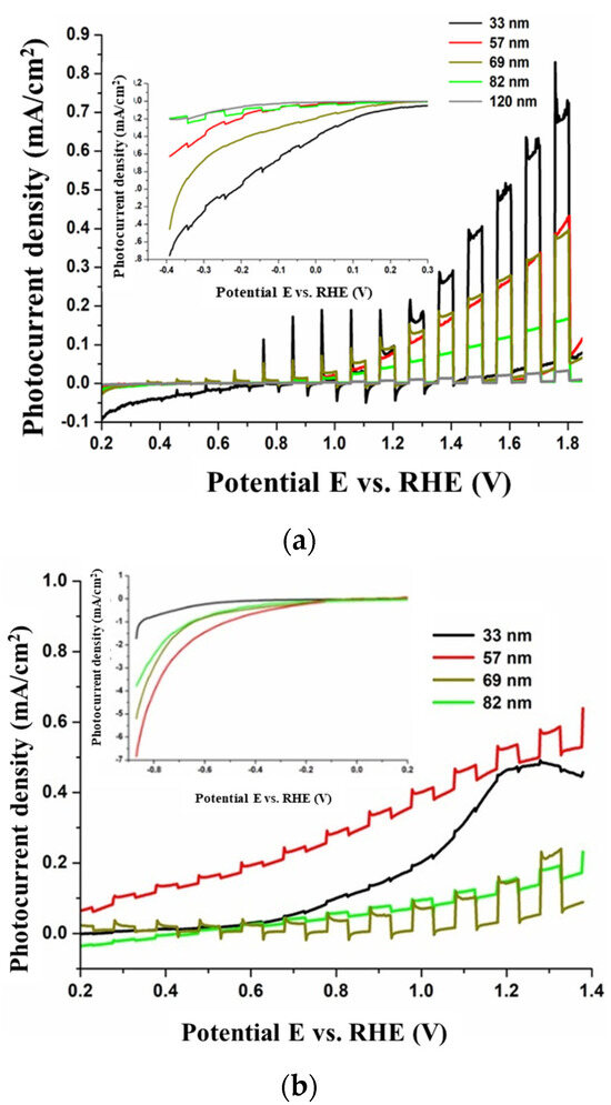 During the potentiodynamic measurements in alkaline conditions, both photocathodic and photoanodic currents are observed, the intensities of oxidation photocurrents being much higher (Figure 9a). The highest photocurrent density is obtained for the thinnest LFO with a value of around 0.75 mA/cm2 at 1.8 V vs. RHE, and it decreases with the increase in film thickness. This behavior is due to the more defective structure of thicker films, these defects acting as recombination traps for photogenerated electrons and positive holes, as already discussed earlier in this review. In an acidic medium, the photoelectrochemical response of LFO films is completely different, only photooxidation activity being observed (Figure 9b). Moreover, the performance of the thinnest LFO film is almost absent, the highest response being obtained for the film with 69 nm thickness. The leakage currents severely increase during the irradiation procedure, excepting the same sample with 69 nm thickness.