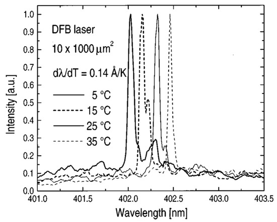 Emission spectra of an InGaN/GaN-based, electrically injected, pulsed DFB laser at a constant injection current of 1.1 × Ith, a threshold current density of Jth = 16 kA/cm2, and at four different device temperatures of 5 °C, 15 °C, 25 °C, and 35 °C. Under these conditions, a temperature tuning coefficient of dλ/dT = 0.14 Å/K was observed. The presented Figure 1 is a re-publication of the 4th figure in reference [6].