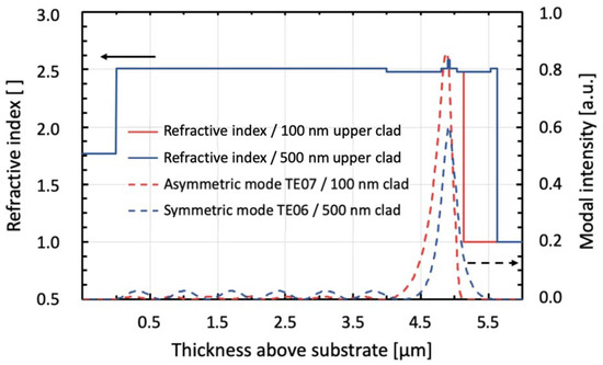 Comparison of optical waveguide profile and simulation using either a standard thickness (500 nm, blue line) or a very thin (100 nm, red line) upper cladding layer. The refractive index profile is drawn on the left; modal intensity on the right y-axis.