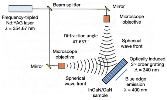 In our case, λ = 400 nm corresponds to the emission wavelength of the In0.15Ga0.85N MQWs, m = 3 is the diffraction order, and neff = 2.5 is the effective refractive index of the InGaN/GaN waveguide. When using this set of parameters—corresponding to a gain-coupled third-order (m = 3) DFB grating designed for an emission wavelength in the violet–blue 400 nm spectral range—this results in a required grating period of Λm = 240 nm. In order to obtain the angle between the surface normal and one of the interfering input beams, we have to solve the complete grating formula (Equation (2)) for the input angle θin below [26,27,28]. It is important to use for the grating exposure the UV radiation of a frequency-tripled Nd:YAG laser at an input wavelength of λin = 354.67 nm: