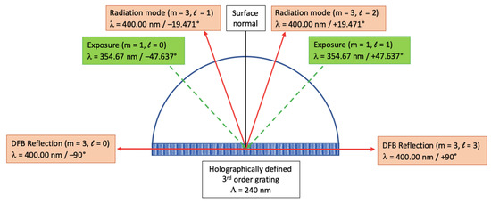 Since the different wavelengths and diffraction orders are quite subtle to understand, we show in Figure 4 a schematic view of the sample along with the different relevant beams, their wavelengths, and their corresponding diffraction orders/angles. As already shown both in Figure 3 and in Table 1, holographic grating exposure will take place at λ = 354.67 nm under angles of θm,ℓ = ±47.637°.