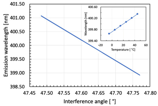 As shown in Figure 6, the DFB laser wavelength can be tuned in a wide range by directly changing the grating period (blue curve without dots). This is accomplished via changing the diffraction angle of the UV-laser-induced interference pattern. The corresponding angular values—as measured between surface normal and one interferometer arm only—measure between 47.732° (399.4 nm) and 47.543° (400.6 nm). The inset of Figure 6 shows emission wavelength as a function of device temperature in steps of 10 K between −5 °C and 45 °C. This tuning is due to the temperature-induced effective refractive index change in the In0.15Ga0.85N/GaN active region; namely, dλ/dT = 0.14 Å/K.