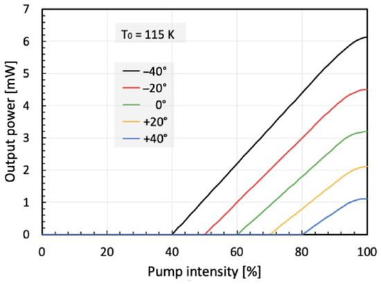 By using this interferometric method, the shape, and the two different tuning rates of gain and DFB peak in Figure 5, the maximal single-mode tuning range of this device can be estimated [15]. Obviously, the different tuning rates of lasing and gain peak (dλDFB/dT ≈ 0.14 Å/K; dλgap/dT ≈ 0.42 Å/K)—as well as the net gain margin vis-à-vis the threshold gain—limit this maximal tuning range. Altogether, a limit of ΔTmax = 80 K is found. Accordingly, we present in Figure 7 the corresponding L−I curves for five typical device temperatures between −40 °C and +40 °C (in steps of 20 K). The output power in this figure corresponds to roughly 10% of the experimentally observed pulsed power levels in reference [6].