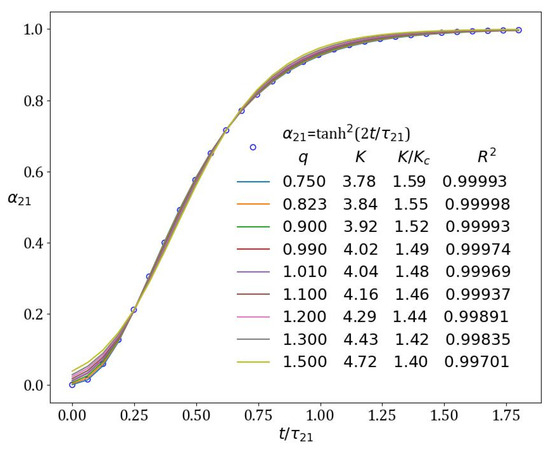 The α21 model is the model with the lowest number of parameters from the HoM, only Nmax and τ21, and we will use these scales first to rescale the number of nuclei N and the time t, a program that is already constructed in [8] to study protein nucleation. The rescaling operation of the N-axis can also be considered as another formulation of the so-called transformation ratio, defined for the purpose of the present study as α ≡ N/Nmax. Ideally, all the rescaled data should collapse onto the same master curve and a failure to conform to this expectation for some of the datasets should be considered a failure of the model to adequately describe this particular dataset. An important aspect in favor of the α21 model is that it is lacking a “tuning exponent” as in the other two models from our hierarchy. Therefore, only the α21 model naturally provides a master curve N/Nmax = tanh2(2t/τ21), while for the other two more complex models, JMAKn and Richards, the “master curves” are as many as there are different values obtained for the “tuning exponents”—n and q, correspondingly. In such situations, one could force the collapse by fixing the excessive parameter(s) to certain presumed value(s), but this has consequences. Conceptually, this means judgement that is outside the numerical procedure. Numerically, this would eventually lead to a decrease in the numerical precision, and we will see an example below.