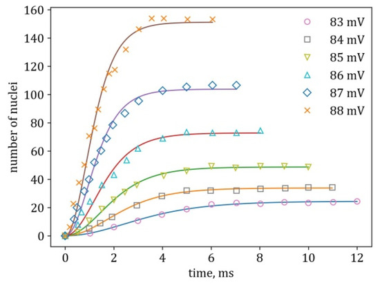 The thorough and precise study of Markov and Stoycheva provides, in our view, a unique opportunity to analyze the nucleation kinetics in terms of the so-called “N(t)-curves” by counting the number of nuclei on the time-scale of milliseconds. In [8] and in the further papers by C. Nanev on the same subject, the logistic dependence was employed to study the kinetics of insulin nucleation. Our present study not only implements a well-thought hierarchy of models with an increasing number of parameters, i.e., complexity, it, in particular, uses a generalization of the logistic model or Verhulst model [9]—the so-called Richards model [10], in which an additional “tweaking” exponent is introduced. Another elaboration beyond [8] is that here, after finding the two scales towards transforming the data into universal forms, we continue by studying the dependencies of the scales used in this transformation on the parameter that makes the several data sets different: the driving force of the process, the overvoltage (in [8] it is the supersaturation). In this way, the program initiated in [8] unfolds to show its full strength.