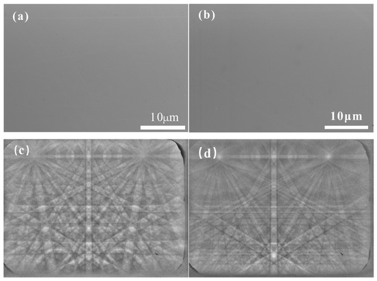 The wurtzite structure GaN and 6H-SiC both belong to the hexagonal P63mc space group. Consequently, the Kikuchi patterns exhibited by the epitaxy film and the substrate exhibit hexagonal characteristics. Figure 1c,d display the Kikuchi patterns on the cross sectional surface of the heteroepitaxy system, which are notably distinct, indicating the flatness of the surfaces and the quality of the GaN crystal structure. Utilizing the HKL CHANNEL5 software, the crystallographic orientation was determined based on the Kikuchi patterns. The findings reveal that both GaN and the 6H-SiC substrate on the cross sectional surface exhibit (10–10) planes.