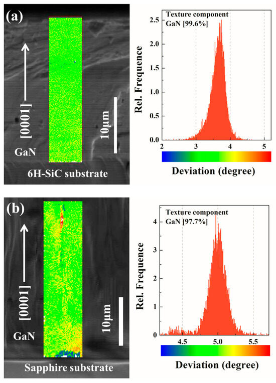 The actual heteroepitaxial structure does not strictly adhere to this orientation due to lattice mismatch. Some misorientation exists in the GaN crystal to accommodate the 6H-SiC substrate, particularly during the initial stages of growth. To assess the distribution of misorientation along the growth direction in different heteroepitaxial systems, EBSD mapping measurements were conducted on the cross-sectional surface near the interface between GaN and the foreign substrates (Figure 3). The reference direction was [0001], and the crystallographic orientation was collected using EBSD from Kikuchi diffraction patterns, yielding three Euler angles at each mapping point. The distribution of deviation from the [0001] direction of GaN epitaxy on 6H-SiC falls within the range of 2.5–4.5° (Figure 3a), while for GaN on the sapphire substrate, this range is 4.5–5.5° (Figure 3b). Larger deviation from the ideal growth direction implies greater lattice deformation, with strain being dependent on this deformation. The different deviation angles indicate that the lattice deformation of GaN epitaxy on sapphire is greater than that on the 6H-SiC substrate. EBSD mapping results for GaN on both 6H-SiC and sapphire demonstrate that deviation from the [0001] direction is greater near the interface and decreases with increasing GaN thickness. This trend aligns with the results obtained from z-axis mapping Raman spectrum measurements of GaN on various foreign substrates [20].