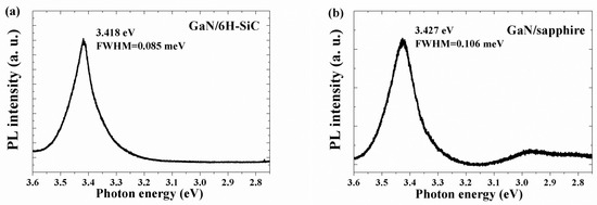Residual stress has an impact on the energy band gap of semiconductor materials. Different types of stress influence the energy band gap in opposite directions: tensile stress decreases it, while compressive stress increases it [36]. In photoluminescence spectra, the peak position of band-edge emission reflects the luminescent band gap. In this context, the PL peak position is influenced by the residual stress in the GaN crystal. Room temperature PL spectra of GaN crystals on 6H-SiC and sapphire substrates were obtained (Figure 5). The band-edge emission peak positions for these samples are 3.418 eV and 3.427 eV, respectively. A previous study reported a linear relationship with a linear coefficient of 21.1 meV/GPa for the luminescent band gap of GaN with respect to residual stress [36]. The difference in stress values for GaN on these substrates, calculated using this method, is 0.426 GPa, which is consistent with the Raman results (0.38 GPa + 0.047 GPa = 0.427 GPa). Additionally, the full width at half maximum (FWHM) of the band-edge emission peak for GaN on the 6H-SiC substrate is smaller than that on the sapphire substrate, indicating better crystal quality for GaN on 6H-SiC.